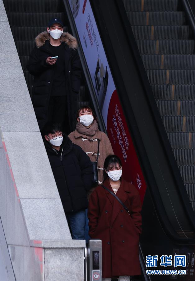 2月24日,在韓國(guó)首爾,當(dāng)?shù)鼐用癯俗詣?dòng)扶梯。 新華社記者 王婧嬙 攝