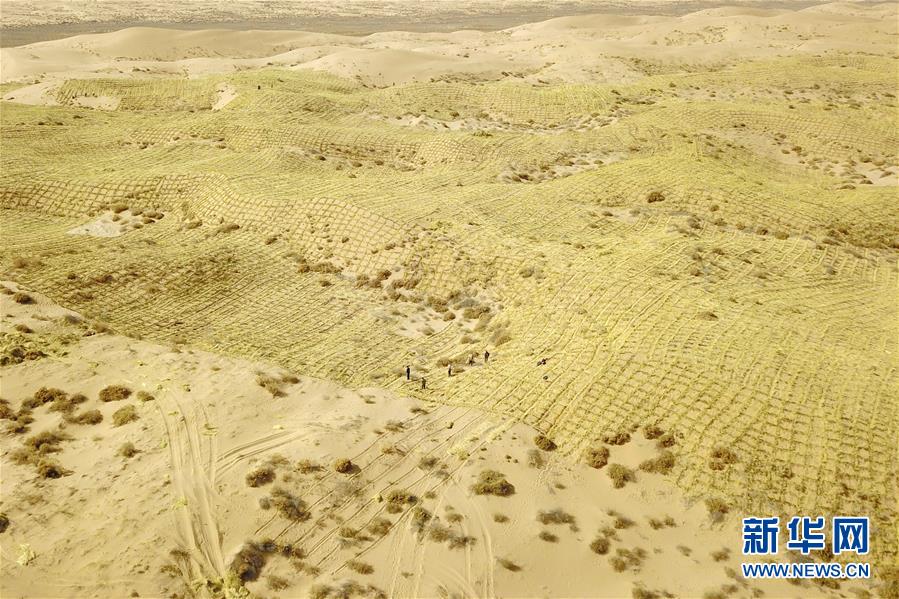 3月5日,在古浪縣北部沙區(qū)旱麻崗治沙點(diǎn),群眾扎草方格壓沙(無(wú)人機(jī)照片)。初春時(shí)節(jié),在騰格里沙漠南緣的甘肅省武威市古浪縣,當(dāng)?shù)馗刹柯毠ぜ鞍瞬缴沉謭?chǎng)治沙人共同在縣城北部沙區(qū)旱麻崗治沙點(diǎn)開(kāi)展春季治沙勞動(dòng)。新華社記者 范培珅 攝