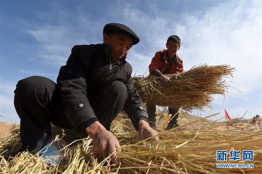 3月5日,在古浪縣北部沙區(qū)旱麻崗治沙點(diǎn),八步沙林場(chǎng)第二代治沙人郭萬(wàn)剛(左)和第三代治沙人郭璽扎草方格壓沙。初春時(shí)節(jié),在騰格里沙漠南緣的甘肅省武威市古浪縣,當(dāng)?shù)馗刹柯毠ぜ鞍瞬缴沉謭?chǎng)治沙人共同在縣城北部沙區(qū)旱麻崗治沙點(diǎn)開(kāi)展春季治沙勞動(dòng)。新華社記者 范培珅 攝