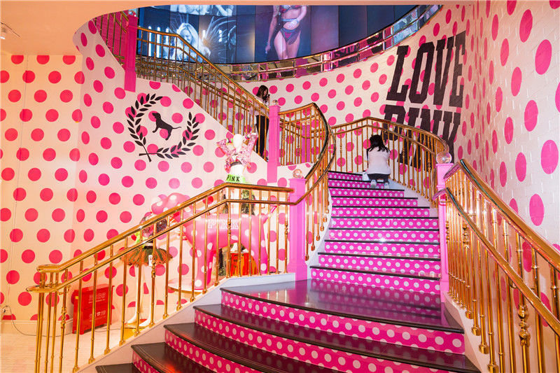 2018年5月17日,北京王府井維密旗艦店。店內(nèi)旋梯很漂亮,上下一共3層,1、2層巨大的環(huán)形電視墻,播放著維密超模走秀的視頻,地下一層粉嫩的風(fēng)格粉嫩,充滿(mǎn)了少女心。劉鋒/千龍圖像/視覺(jué)中國(guó)