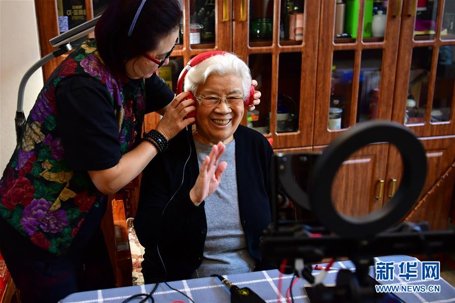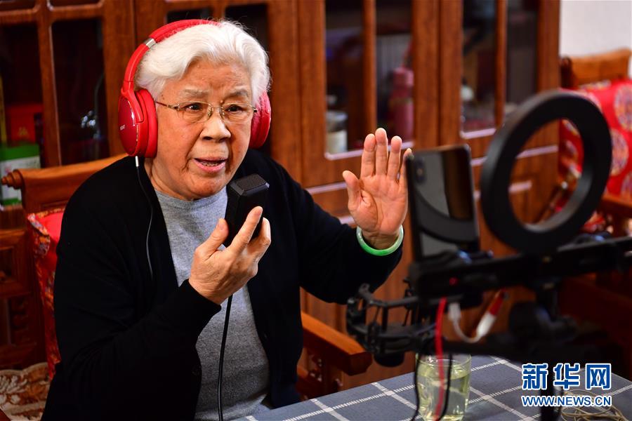 閻惠貞(右)在和直播平臺(tái)的戲迷打招呼(3月6日攝)。 新華社記者 曹陽 攝