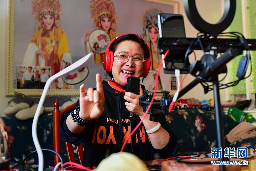 武凌云在直播中演唱晉劇片段(3月5日攝)。 新華社記者 曹陽 攝