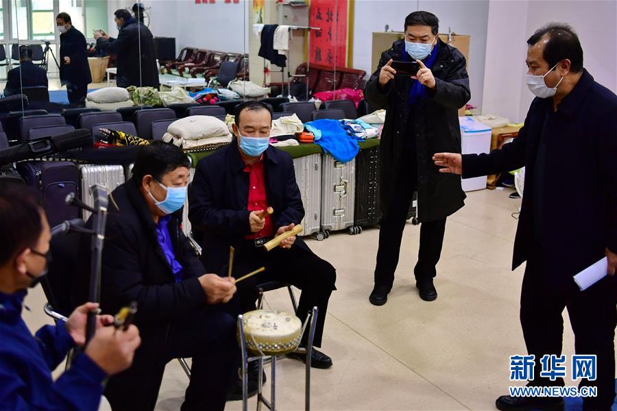 太原市晉劇藝術(shù)研究院的工作人員在為戲迷直播武凌云(左二)排練晉劇(3月9日攝)。 新華社記者 曹陽 攝