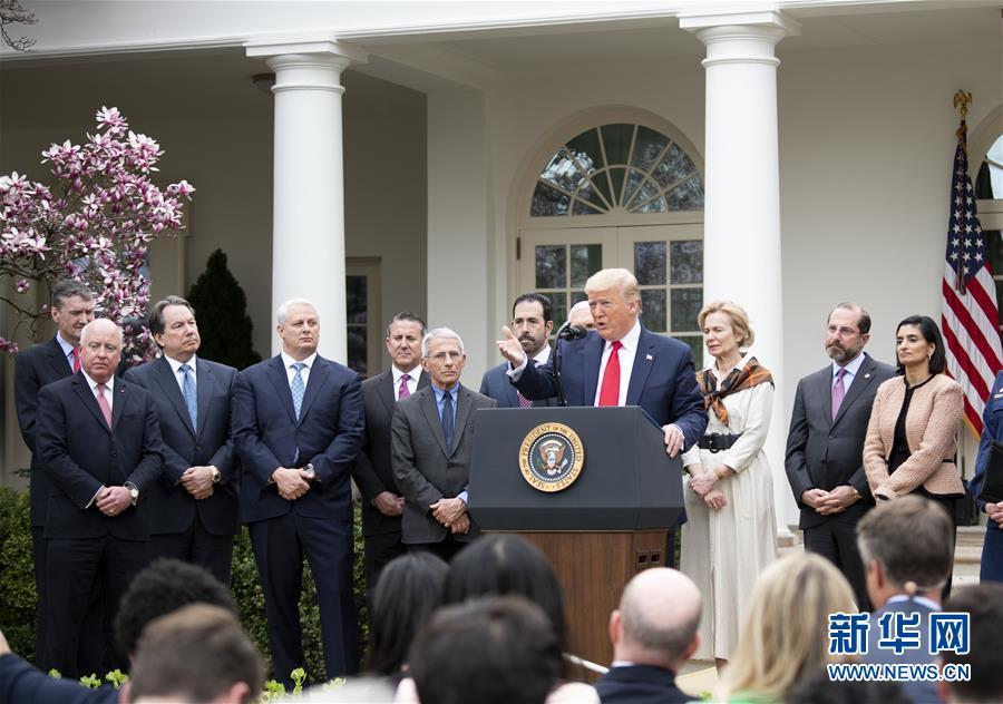 3月13日,美國總統(tǒng)特朗普(中)在華盛頓白宮的記者會上講話。特朗普當(dāng)天下午在白宮發(fā)表講話時正式宣布“國家緊急狀態(tài)”。他說,此舉旨在讓美國聯(lián)邦政府全力投入到抗擊新冠肺炎疫情的努力中。這項舉措將釋放500億美元資金,幫助各州和地方政府應(yīng)對疫情。新華社記者劉杰攝