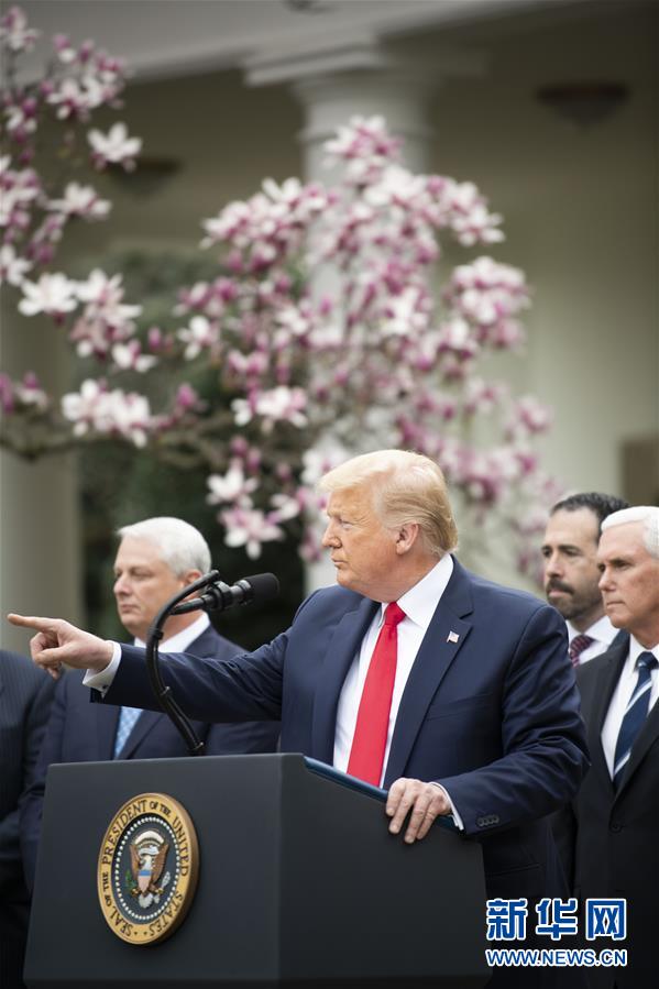 3月13日,在美國(guó)華盛頓白宮,美國(guó)總統(tǒng)特朗普(前)出席記者會(huì)。特朗普當(dāng)天下午在白宮發(fā)表講話時(shí)正式宣布“國(guó)家緊急狀態(tài)”。他說(shuō),此舉旨在讓美國(guó)聯(lián)邦政府全力投入到抗擊新冠肺炎疫情的努力中。這項(xiàng)舉措將釋放500億美元資金,幫助各州和地方政府應(yīng)對(duì)疫情。新華社記者劉杰攝