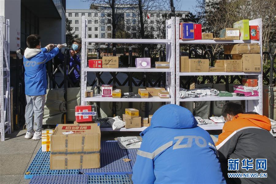 3月12日,李杰(左一)在中國青年政治學(xué)院快遞點隔著柵欄給客戶遞送包裹。新華社記者張玉薇攝