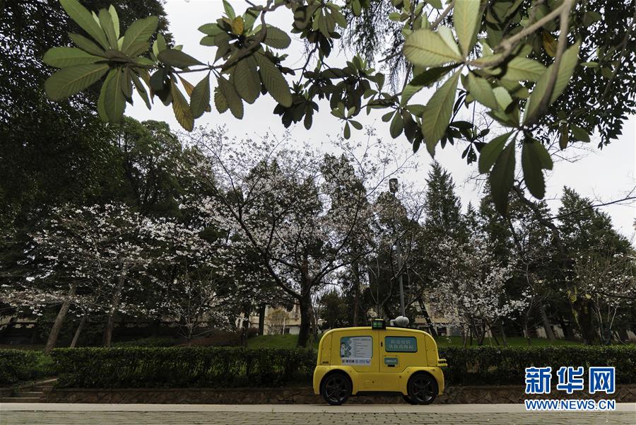 一輛5G無人攝像車在武漢大學櫻花大道進行不間斷無人巡游,實時采集和傳輸直播圖像信號(3月16日攝)。新華社記者費茂華攝