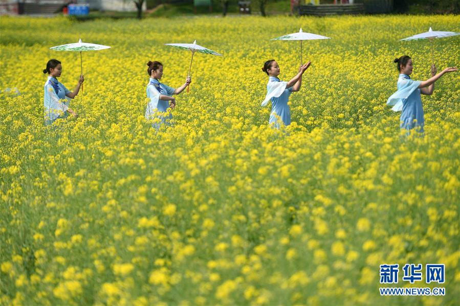 3月16日,演員在李坑村的油菜花田里表演。 新華社記者 萬象 攝