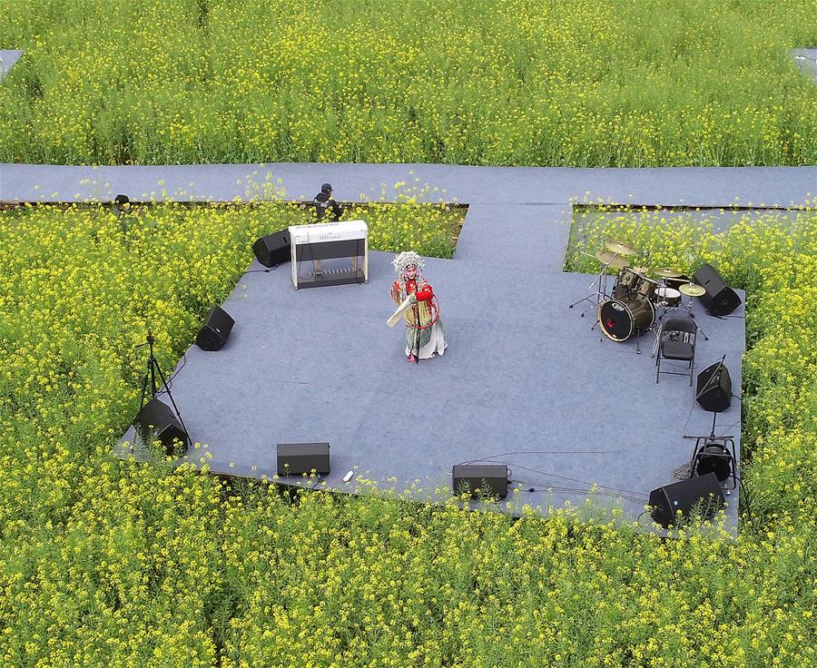 3月16日,演員在李坑村的“花田音樂會”上表演戲曲(無人機(jī)照片)。 新華社記者 萬象 攝