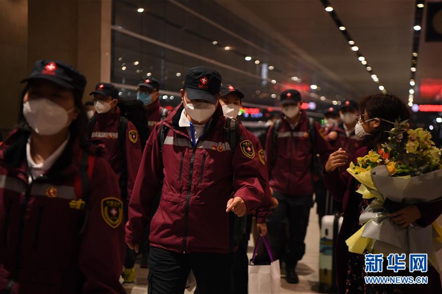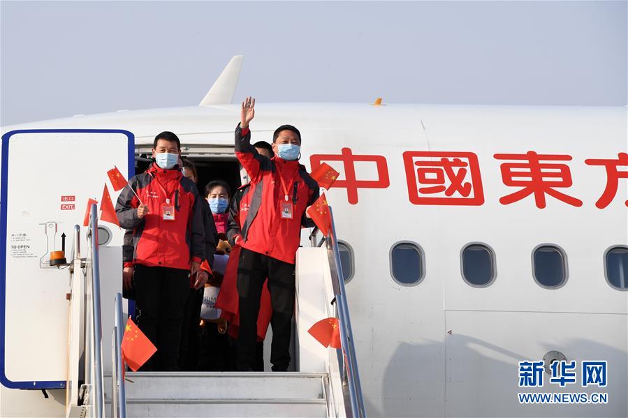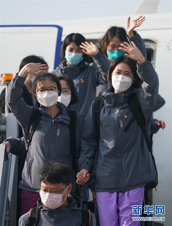 3月17日,醫(yī)療隊(duì)隊(duì)員抵達(dá)山東濟(jì)南遙墻國際機(jī)場。新華社發(fā)(饒琦攝)