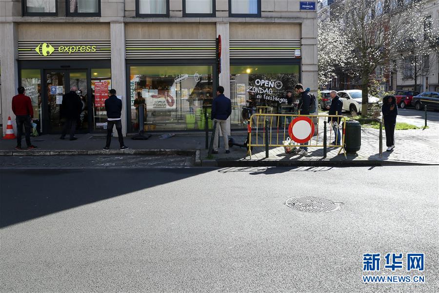 3月18日,在比利時布魯塞爾,顧客排隊等待進入超市購物。 新華社記者 張鋮 攝