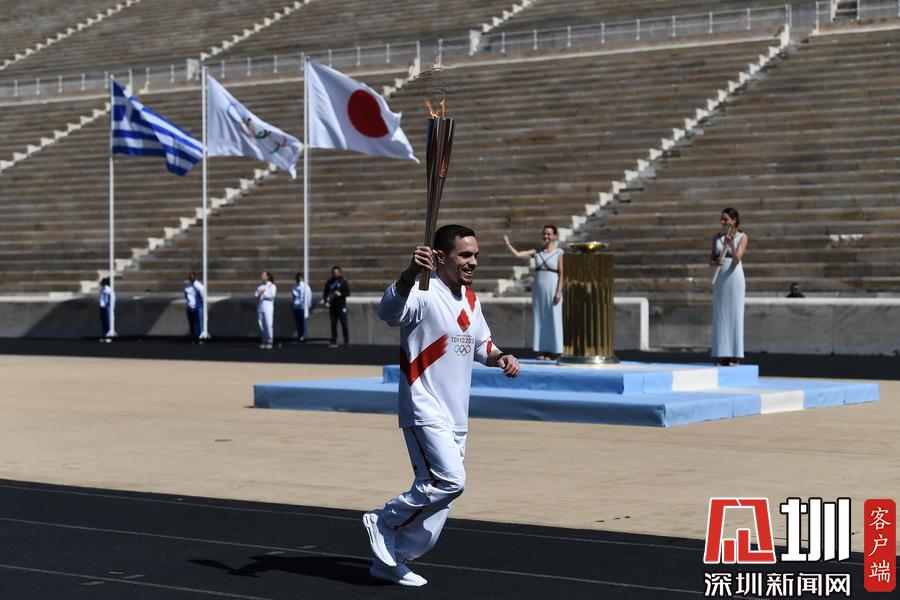 3月19日,希臘藝術(shù)體操運動員埃萊夫塞里奧斯·彼得羅尼亞斯手持圣火火炬跑入體育場。