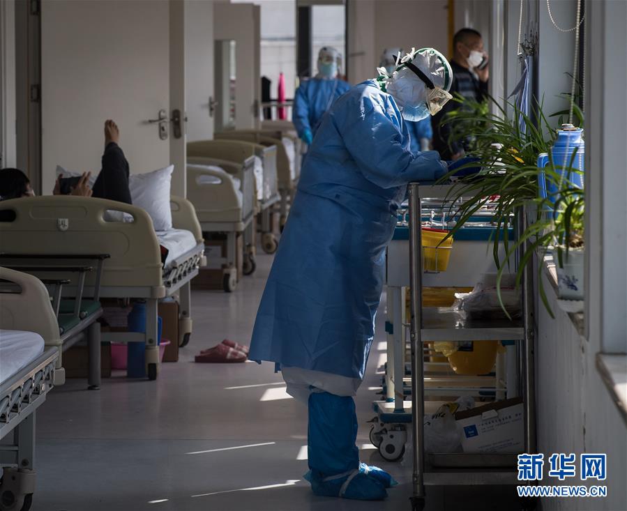 3月19日,在武漢市肺科醫(yī)院隔離病房,內蒙古醫(yī)療隊隊員陳亮在現(xiàn)場忙碌。 新華社記者 肖藝九 攝