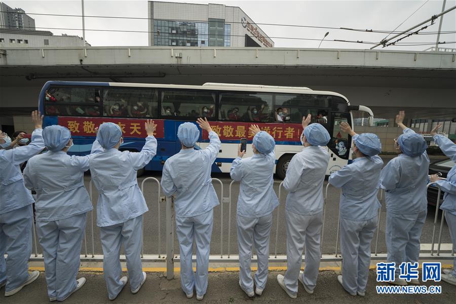 3月21日,武漢市第一醫(yī)院的醫(yī)護人員(前)送別天津市醫(yī)療隊隊員。新華社記者費茂華攝