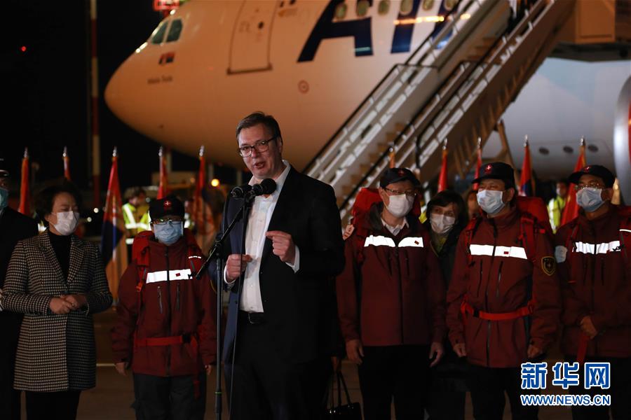 3月21日,在塞爾維亞首都貝爾格萊德,塞爾維亞總統(tǒng)武契奇在歡迎中國援助塞爾維亞抗疫醫(yī)療專家組的儀式上致辭。 中國援助塞爾維亞抗疫醫(yī)療專家組一行6人21日晚乘專機抵達塞首都貝爾格萊德,由中國政府捐贈的一批醫(yī)療物資同機抵達。 新華社記者 石中玉 攝