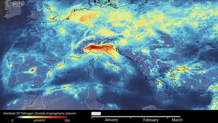 動(dòng)圖說(shuō)明:歐洲航天局衛(wèi)星日前監(jiān)測(cè)到,疫情期間意大利二氧化氮等污染氣體排放量明顯下降(衛(wèi)星:Sentinel-5P)。衛(wèi)星攜帶的各類傳感器能夠采集空氣中懸浮物顆粒的電磁波信號(hào),從而對(duì)空氣質(zhì)量做出分析判斷。圖中的黃色代表二氧化氮等污染氣體的濃度。