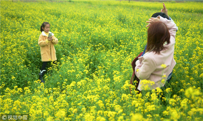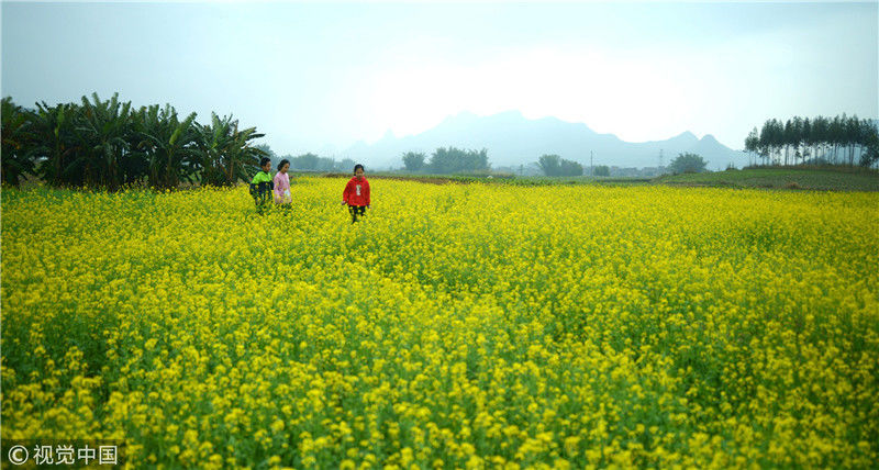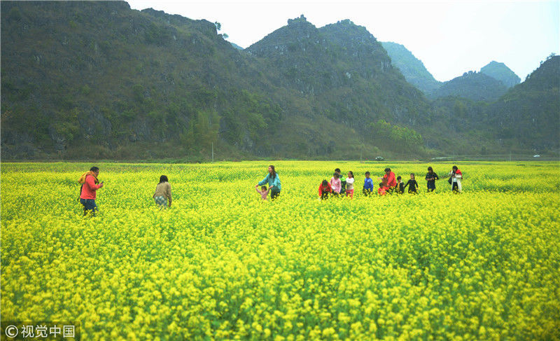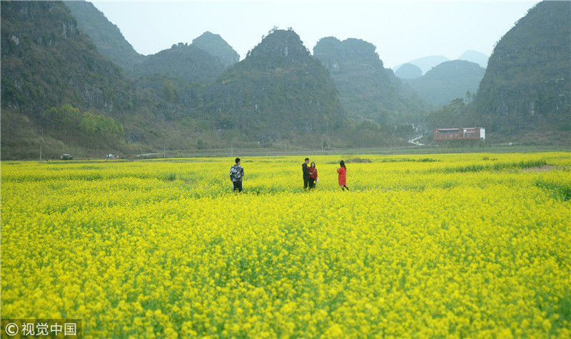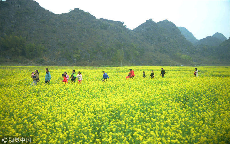 2019年2月5日,春節(jié)期間,廣西來賓市忻城縣萬余畝油菜花競相綻放,吸引眾多游客前來賞花游玩,感受春天的氣息。近年來,廣西忻城縣大力實施鄉(xiāng)村振興戰(zhàn)略,注重發(fā)展鄉(xiāng)村旅游產(chǎn)業(yè),把鄉(xiāng)村旅游與美麗鄉(xiāng)村、脫貧攻堅緊密結(jié)合起來,輻射帶動當?shù)刎毨裘撠氈赂弧7B光/視覺中國