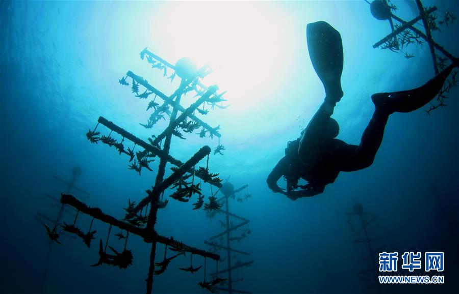 3月28日,在位于海南三亞蜈支洲島旅游區(qū)的海洋牧場(chǎng),工作人員在進(jìn)行巡護(hù)。近日,位于海南三亞蜈支洲島旅游區(qū)的海洋牧場(chǎng)復(fù)工,海底作業(yè)逐漸恢復(fù)正常,開(kāi)始進(jìn)行人工魚(yú)礁吊裝擺位、水下監(jiān)控清理以及日常巡護(hù)等工作。據(jù)介紹,人工魚(yú)礁有利于魚(yú)類種類增加和數(shù)量提高,蜈支洲島海域海洋牧場(chǎng)人工魚(yú)礁表面附著珊瑚、貝類、藻類等生物種類達(dá)120余種。新華社記者楊冠宇攝
