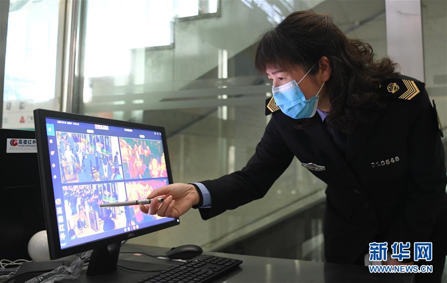 3月28日,工作人員在武漢站出站口監(jiān)看檢測體溫的儀器。新華社記者程敏攝
