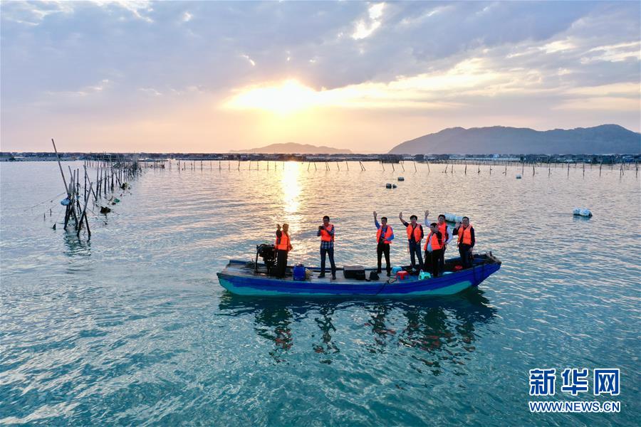 3月26日,福建漳州東山縣岐下村村民陳炎松(左一)駕駛著小舢板載著客人返回碼頭(無人機照片)。新華社記者姜克紅攝
