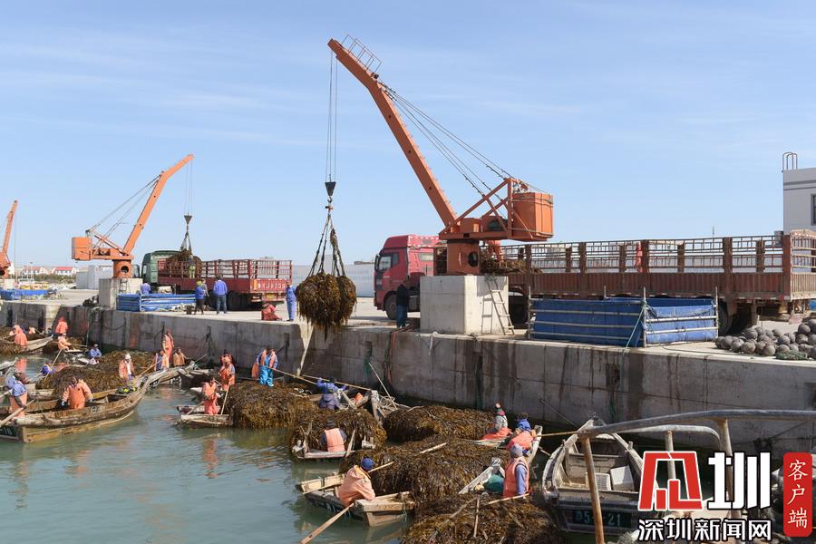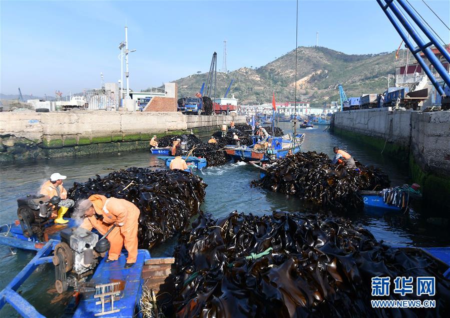 4月10日,霞浦縣長春鎮(zhèn)海帶養(yǎng)殖戶在埕塢碼頭吊運(yùn)海帶。新華社記者姜克紅攝