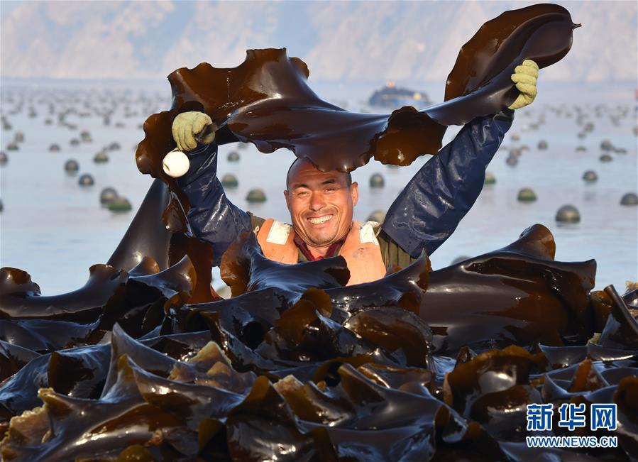 海島居民們?cè)陴B(yǎng)殖區(qū)收割海帶(5月24日攝)。新華社記者朱崢攝