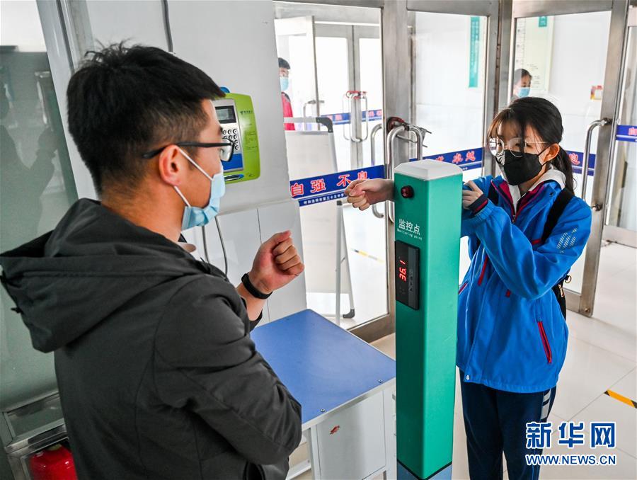 3月30日,呼和浩特市第三十五中學初三年級學生進入教學樓時測量體溫。當日,內蒙古自治區(qū)全區(qū)高三和初三年級開學復課。新華社記者連振攝