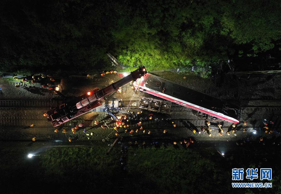 3月30日晚,工程機(jī)械在京廣鐵路郴州段脫軌事故現(xiàn)場(chǎng)作業(yè)(無人機(jī)照片)。新華社記者李尕?cái)z