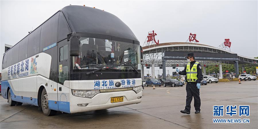 3月24日,在武漢西高速收費(fèi)站交通卡點(diǎn),執(zhí)勤民警準(zhǔn)備檢查車輛。新華社記者才揚(yáng)攝