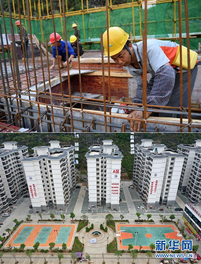 拼版照片:上圖為工人在廣西都安瑤族自治縣八仙易地扶貧搬遷安置新區(qū)項目施工(2016年7月25日攝);下圖為已經(jīng)建成入住的廣西都安瑤族自治縣八仙易地扶貧搬遷安置新區(qū)部分樓房(無人機照片,2019年10月16日攝)。新華社記者陸波岸攝