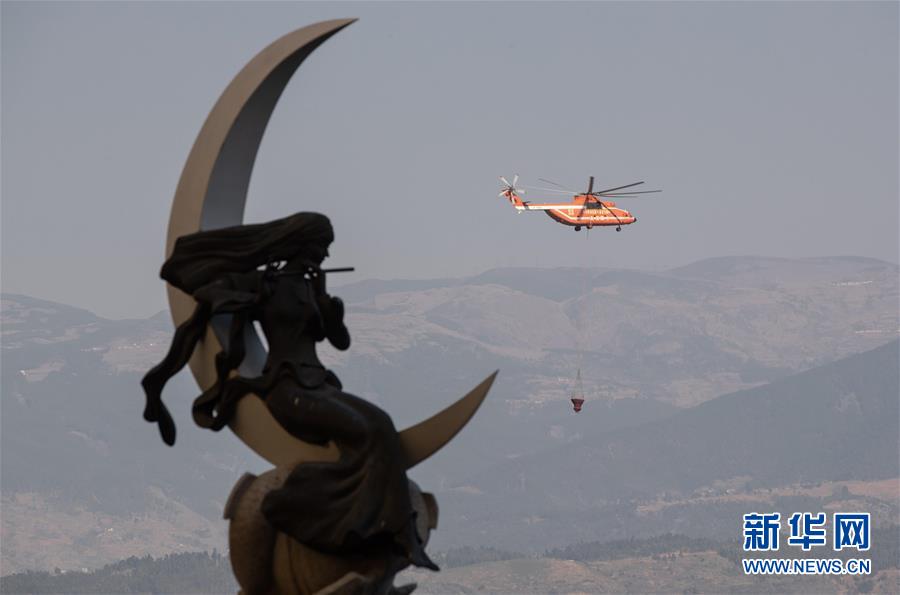 3月31日,一架參與西昌森林火災滅火的直升機在邛海中取完水飛向火場。新華社記者江宏景攝