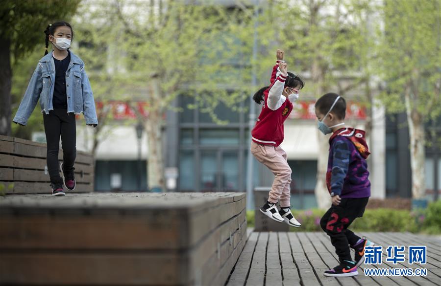4月1日,在武漢天地廣場,幾個小朋友在玩耍。新華社記者費茂華攝