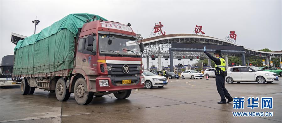 3月24日,在武漢西高速收費站交通卡點,執(zhí)勤民警陳鋼示意載有復工復產(chǎn)人員的大巴通行。新華社記者才揚攝