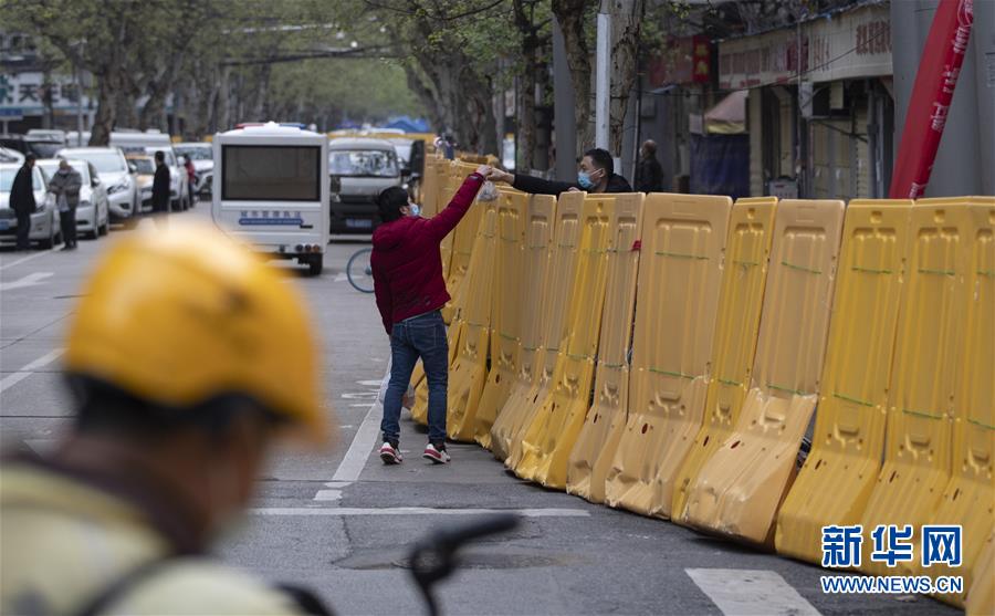 4月1日,在前進二路,人們隔著隔離墻遞送食品。新華社記者費茂華攝