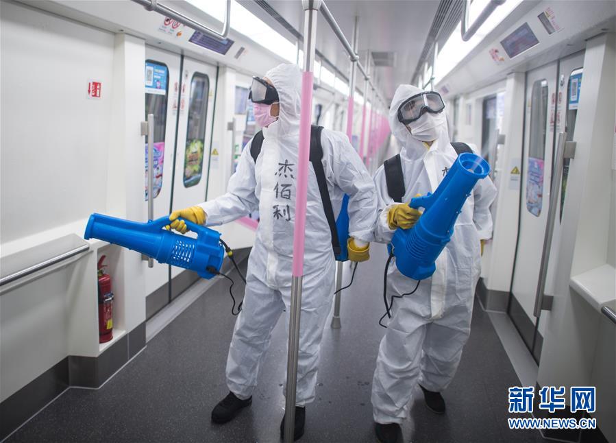 3月23日,在武漢地鐵常青車輛段,保潔人員在為地鐵列車消毒。新華社記者肖藝九攝