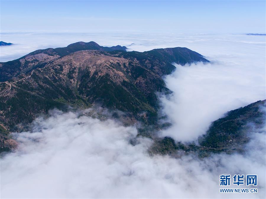 武夷山國(guó)家公園最高峰黃崗山云霧繚繞(4月1日攝,無(wú)人機(jī)照片)。  新華社記者 姜克紅 攝