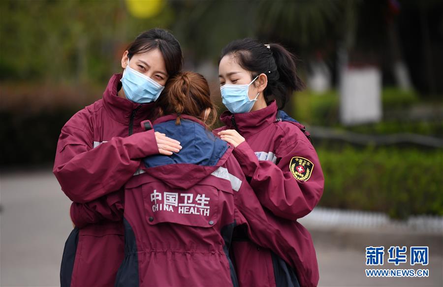 4月3日,陜西醫(yī)療隊隊員擁抱告別。 當日,陜西省第一批援鄂醫(yī)療隊137名隊員在陜西省工人療養(yǎng)院結束了為期兩周的隔離休養(yǎng)。醫(yī)療隊員與“戰(zhàn)友”深情作別后,陸續(xù)踏上歸途。 新華社記者 李一博 攝