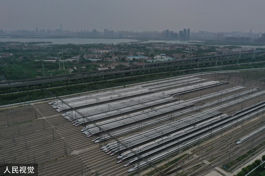 2020年4月6日,武漢動(dòng)車段高鐵動(dòng)車組整裝待發(fā)(無(wú)人機(jī)照片)。