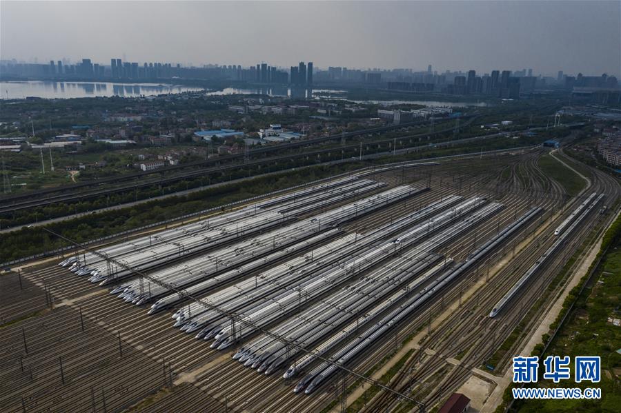 4月7日,在武漢動車段,列車??吭诖孳嚲€上(無人機(jī)照片)。新華社記者 沈伯韓 攝