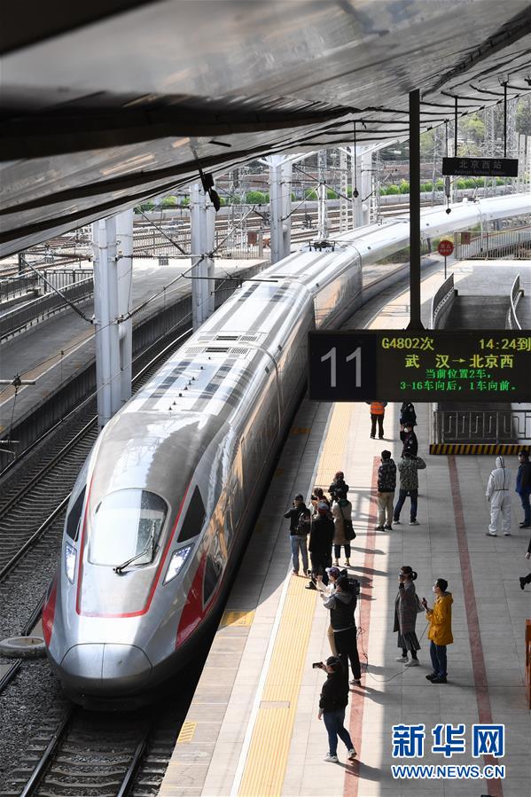 4月8日,G4802次列車駛入北京西站。當日,武漢市正式解除離漢離鄂通道管控措施,首趟武漢返京列車G4802次列車抵達北京西站。新華社記者鞠煥宗攝