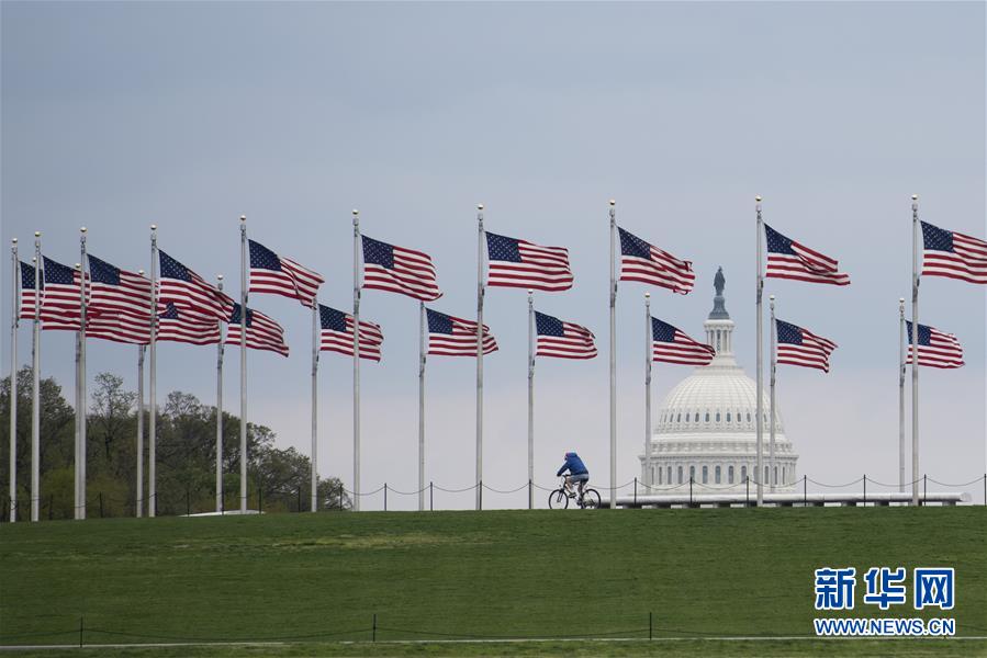 4月1日,在美國(guó)首都華盛頓,一名男子從美國(guó)國(guó)旗前騎車經(jīng)過(guò)。