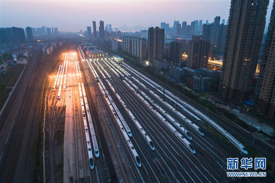 4月8日,在武漢動車段,列車停靠在存車線上準備投入運行(無人機照片)。新華社記者肖藝九攝