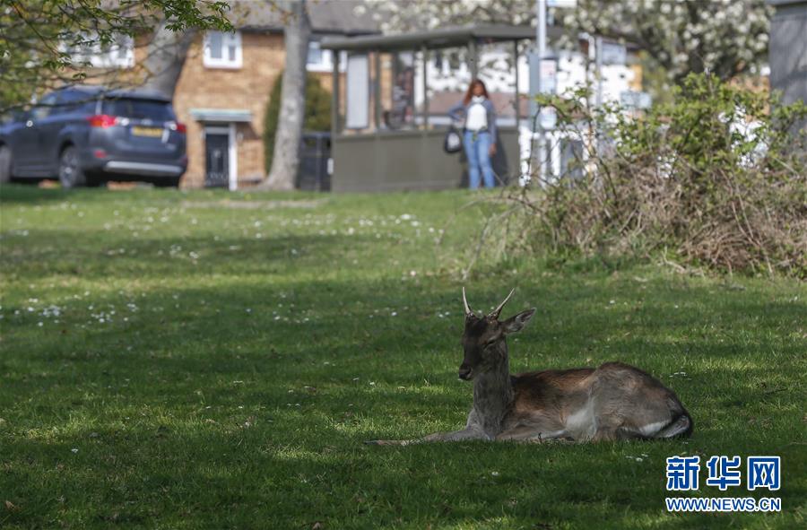 4月8日,在英國倫敦東部一個居民區(qū),附近公園里的鹿在草坪上休息。隨著新冠疫情在英國的擴散,政府要求人們減少不必要的外出。倫敦東部一個居民區(qū)附近公園里原來散養(yǎng)的鹿紛紛從公園走出來,或吃草或接受附近居民的喂食,成為特殊時期居民區(qū)里的新“客人”。新華社記者韓巖攝