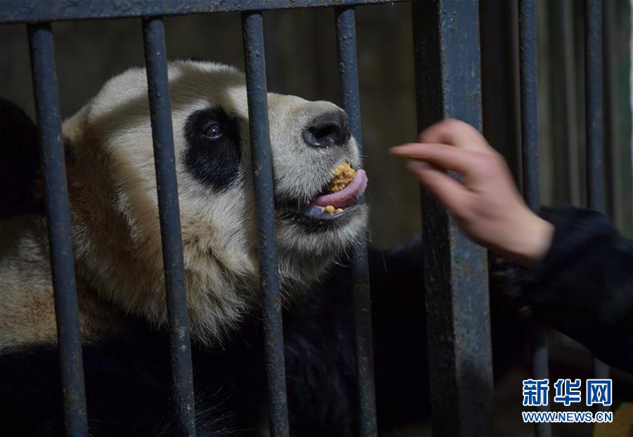 4月14日,中國大熊貓保護研究中心核桃坪基地飼養(yǎng)員周季秋用投喂窩窩頭的方法訓練大熊貓“喜妹”。新華社記者張超群攝