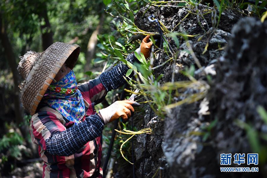 4月21日,施茶村村民王秀文在石斛園采摘石斛鮮條。新華社記者郭程攝
