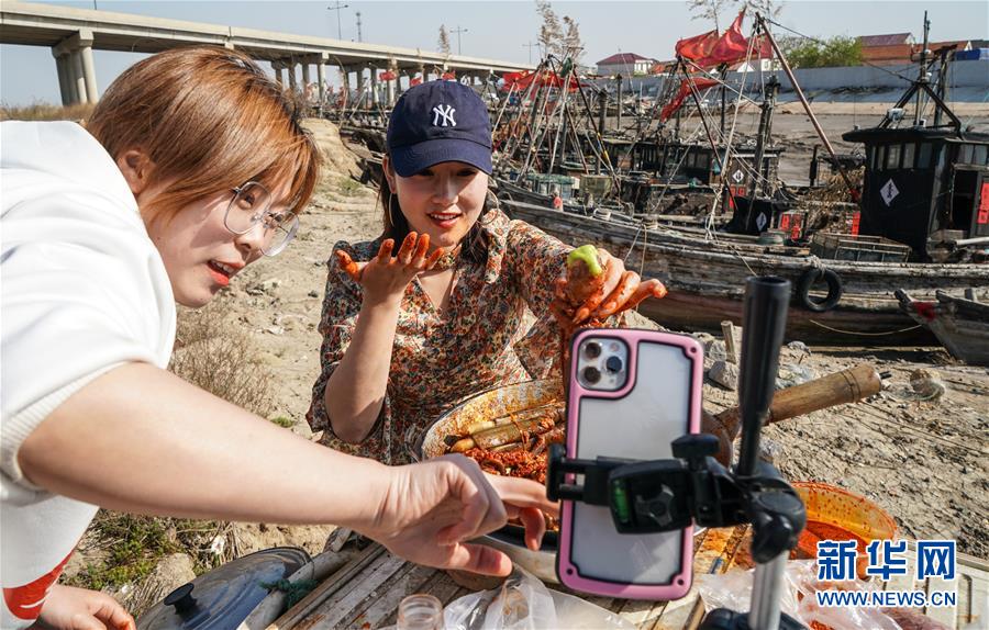 4月22日,周笑(左)在朱蓬口漁港幫助第一次做主播的楊明靜(右)拍攝小視頻。新華社記者楊磊攝