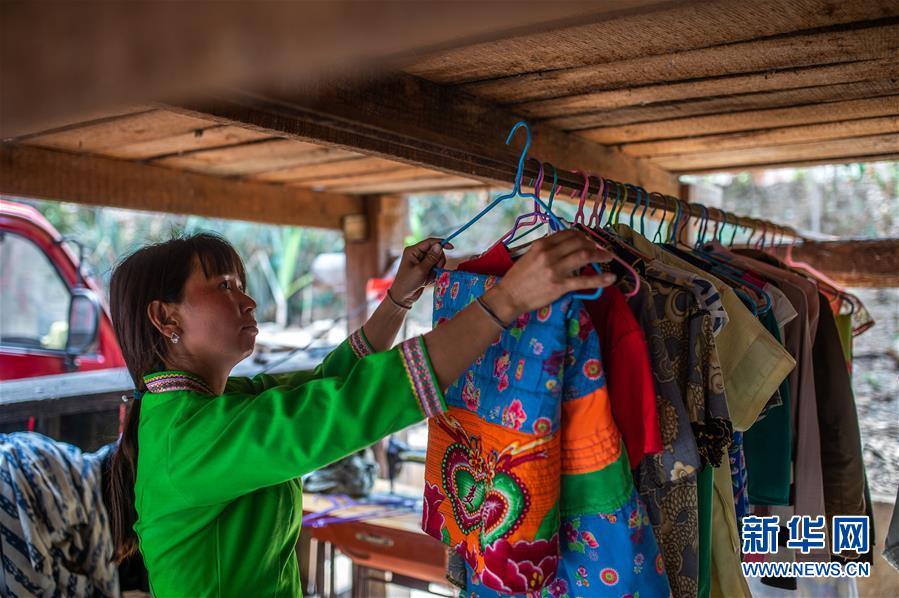 4月12日,在云南省勐??h布朗山鄉(xiāng)曼囡村曼班三隊(duì),娜四在家晾曬衣服。新華社記者胡超攝