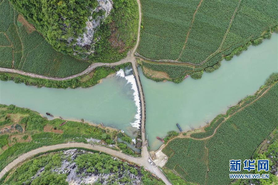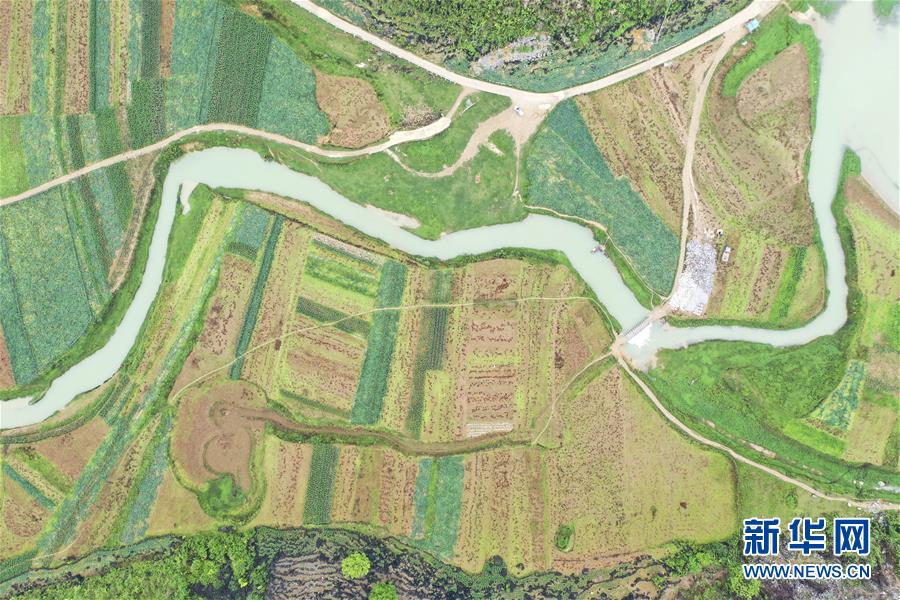 4月23日,在廣西隆安縣南圩鎮(zhèn),農(nóng)人趕著牲畜走過一座小橋(無人機照片)。新華社記者周華攝