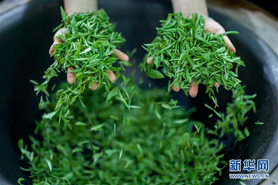 4月25日,工作人員在“扶貧茶園”內制作綠茶。谷雨過后,在貴州省黔東南苗族侗族自治州丹寨縣“扶貧茶園”,茶農搶抓農時趕制春茶。丹寨縣創(chuàng)新產業(yè)扶貧模式,鼓勵社會公眾線上認領茶園,再由茶園聘請當?shù)刎毨魟展?,為貧困戶?chuàng)造茶園管理、采茶、制茶等就業(yè)機會,幫助貧困戶增收。今年以來,“扶貧茶園”已接受線上預訂600余畝,給當?shù)?00余名村民提供了就業(yè)機會。新華社記者歐東衢攝