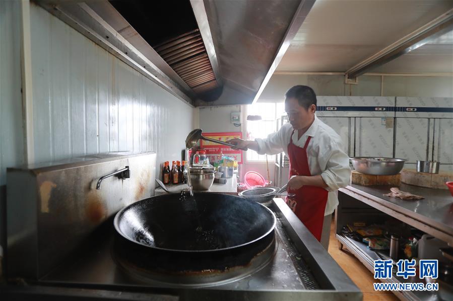 4月25日,海上生活區(qū)的廚師為工友烹飪。新華社記者盧燁攝